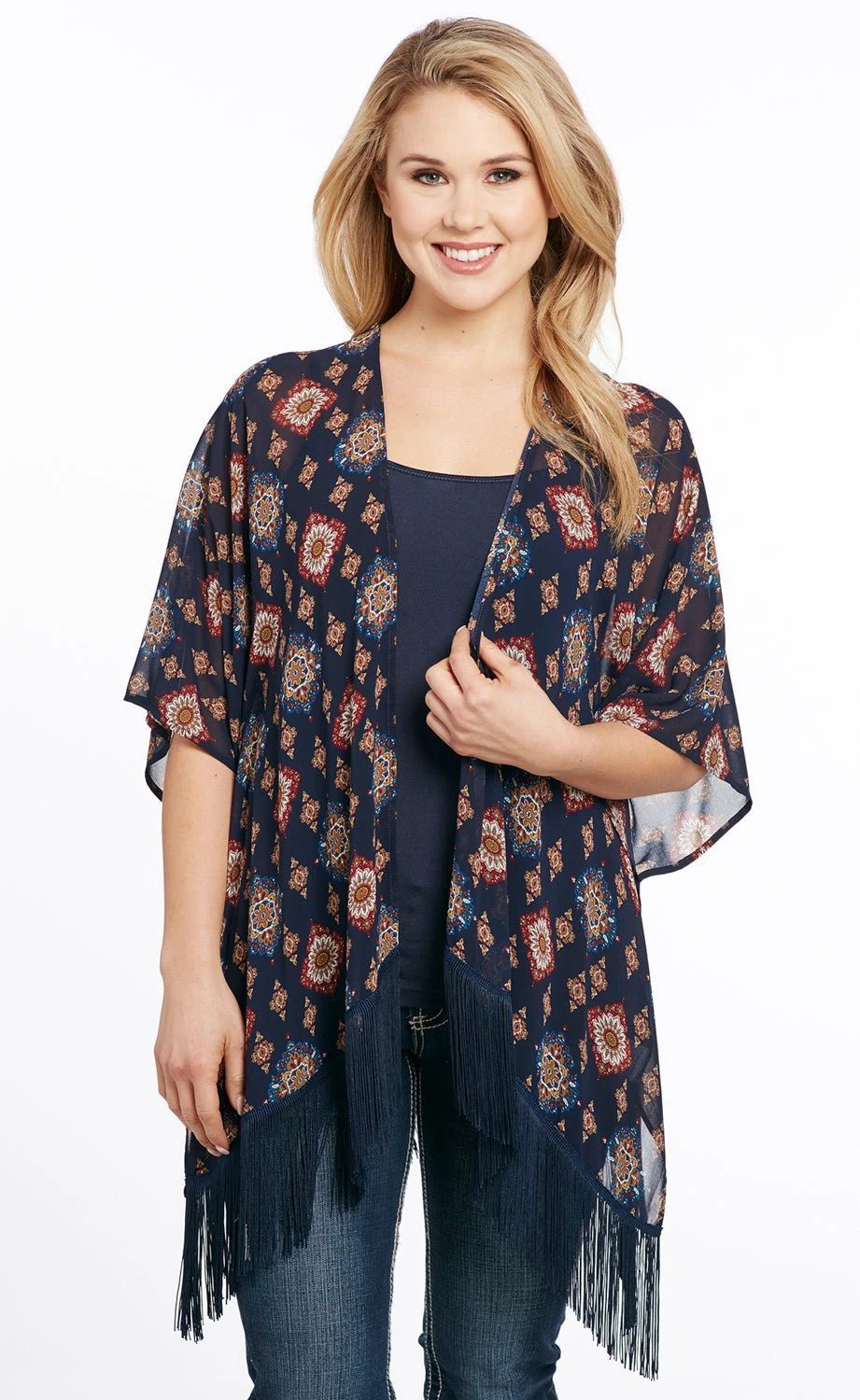 Cowgirl Up Womens Navy 100% Rayon Embroidered Kimono Cardigan