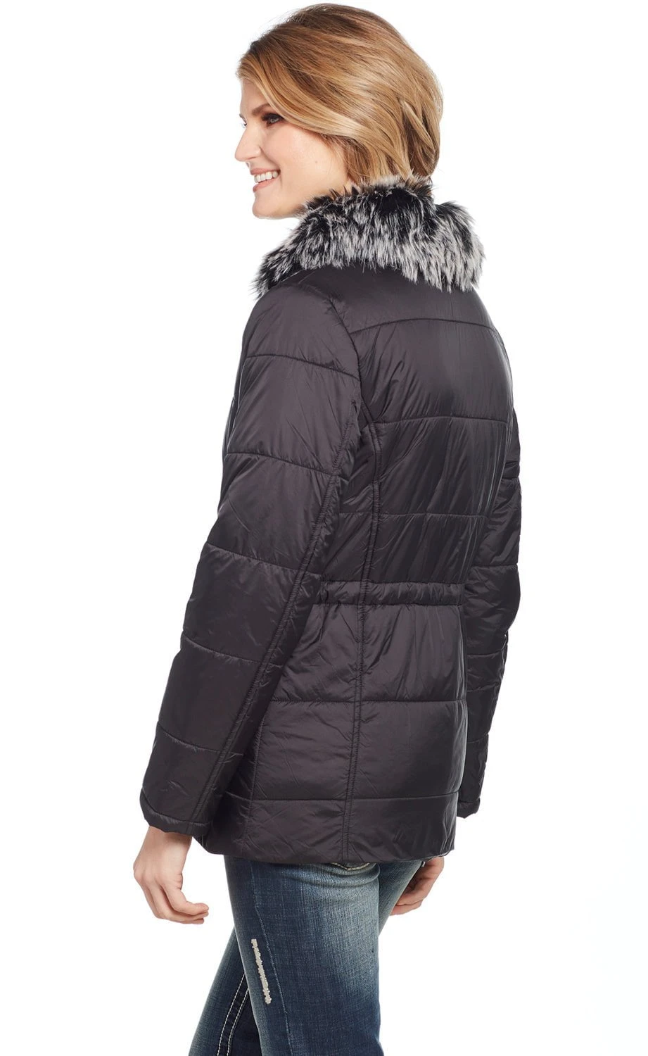 This authentic western style, black nylon womens basic coat features quilted top-stitching, snap and zip up front and removable faux shearling collar. For the best in modern, high-quality western outerwear, Cripple Creek is the brand to trust.