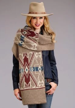 Stetson Womens Tan Multi Wool Blend Aztec Knit Sweater Scarf